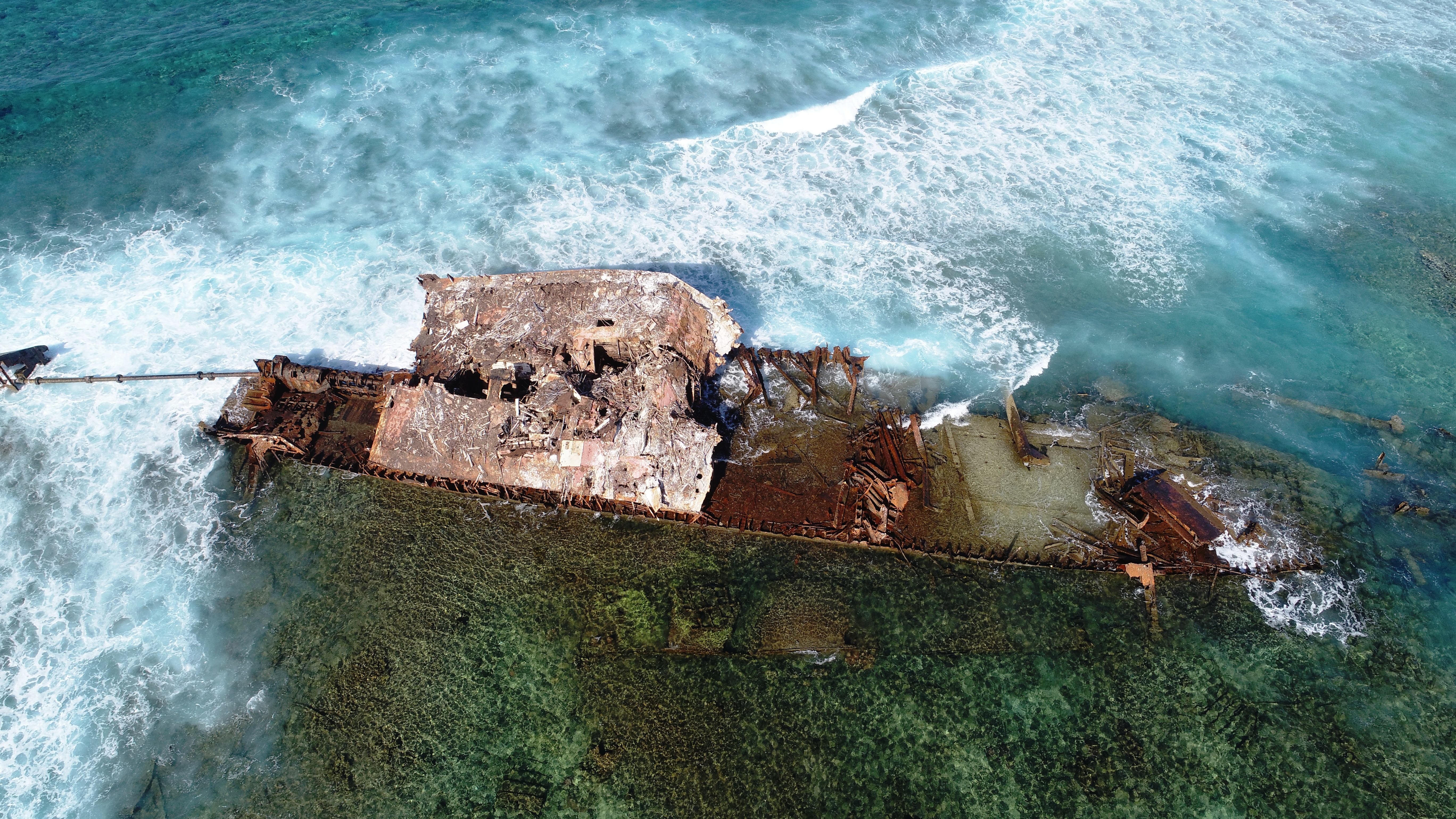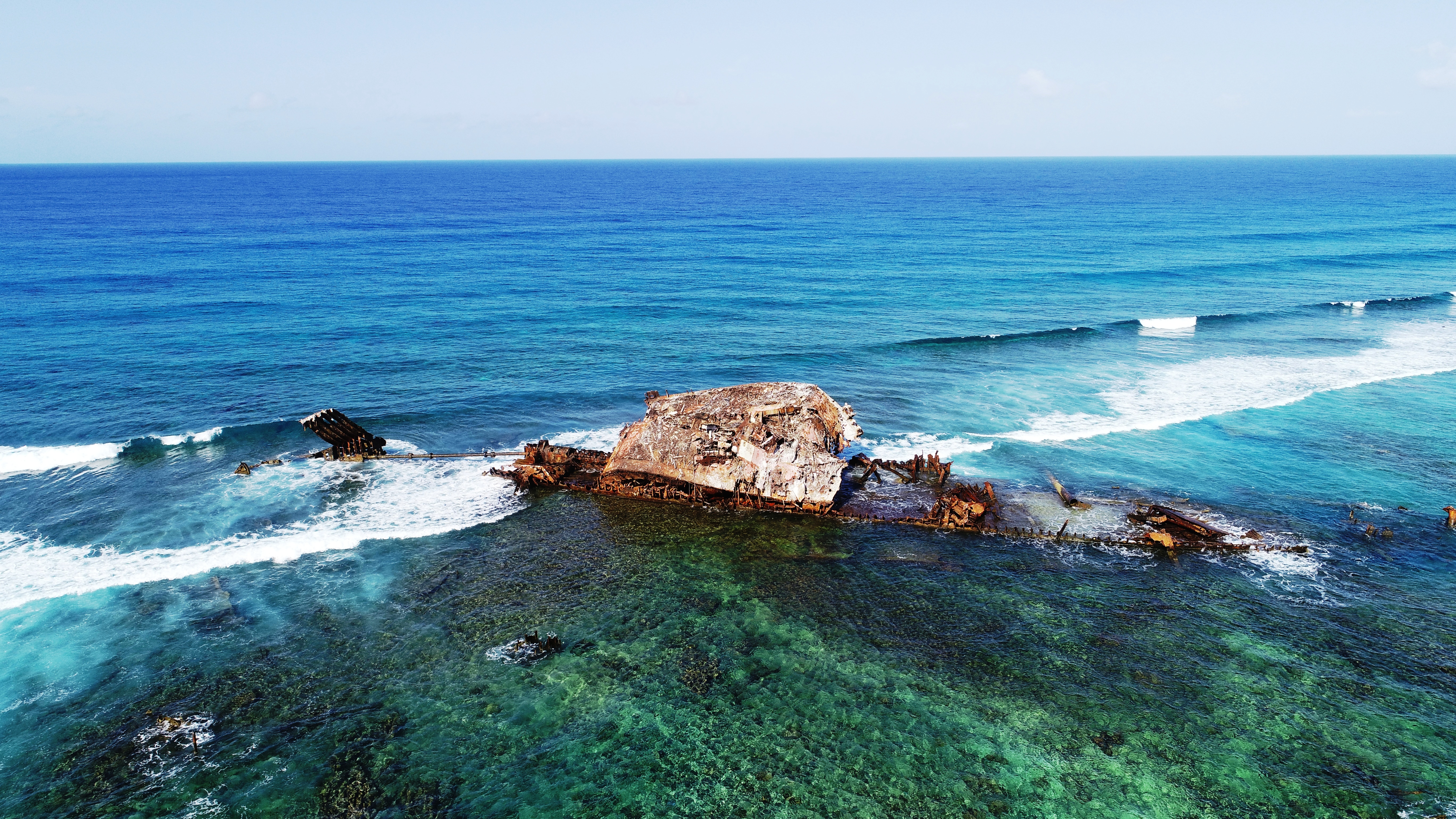 Bei der Annäherung sieht man als erstes das Wrack eines 1963 hier auf Grund gelaufenen Schiffes. Aus der Ferne dachten wir zuerst, hier ragt ein nicht kartographierter einzelner Felsen aus dem Wasser. Erst später erkennt man die Brandung rund um das Riff und nimmt wahr, dass es etwas anderes als Fels sein muss.