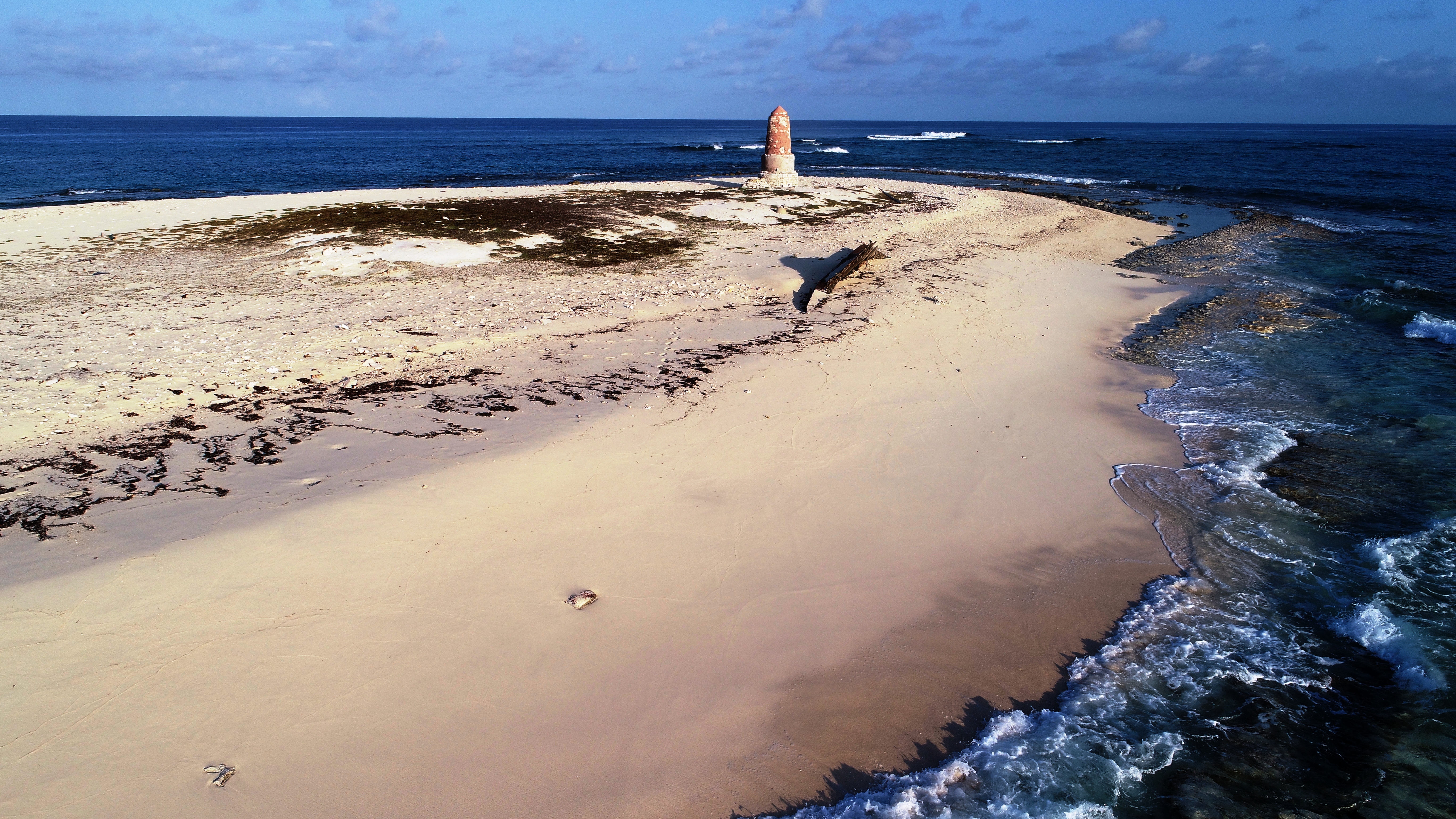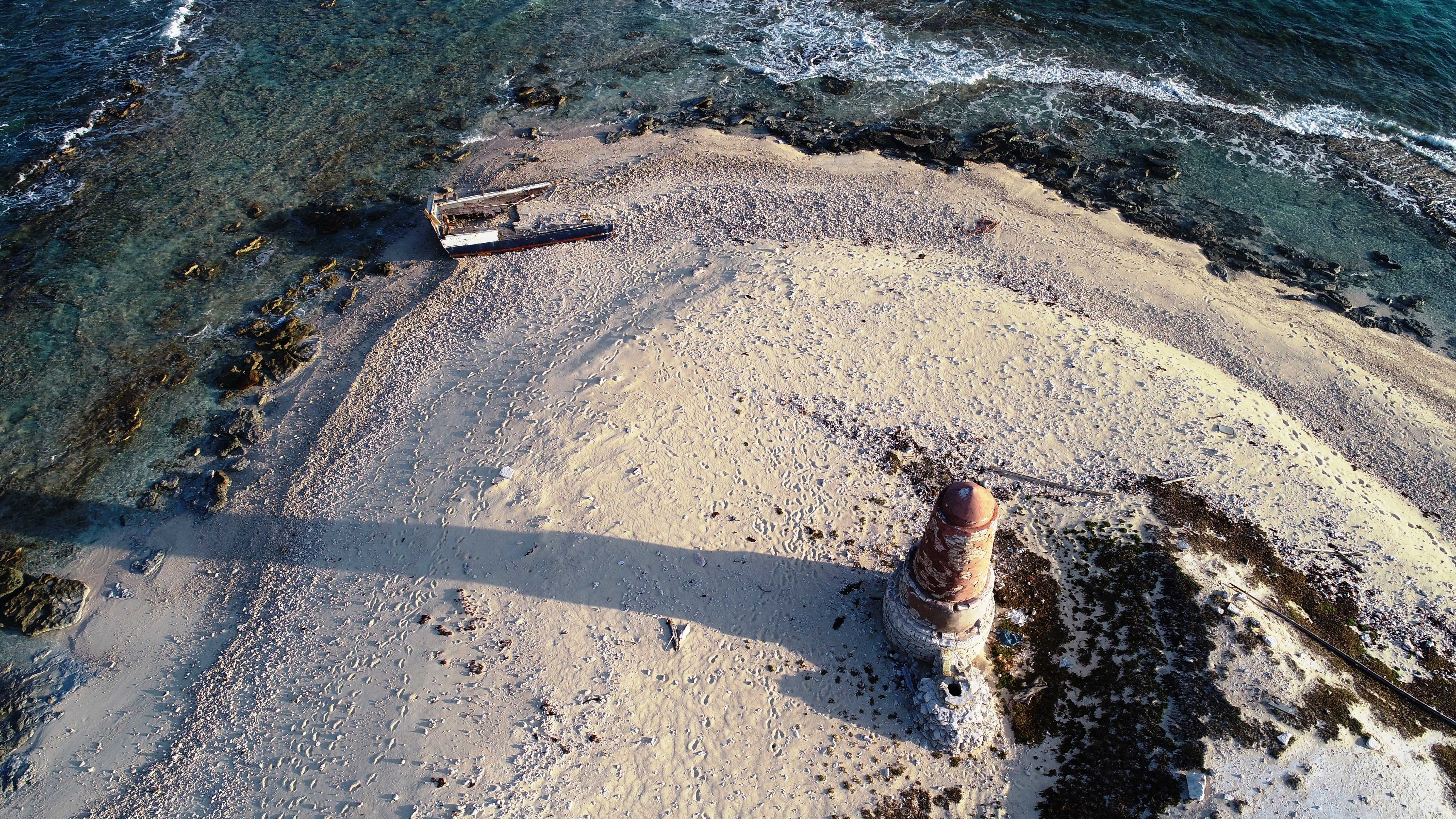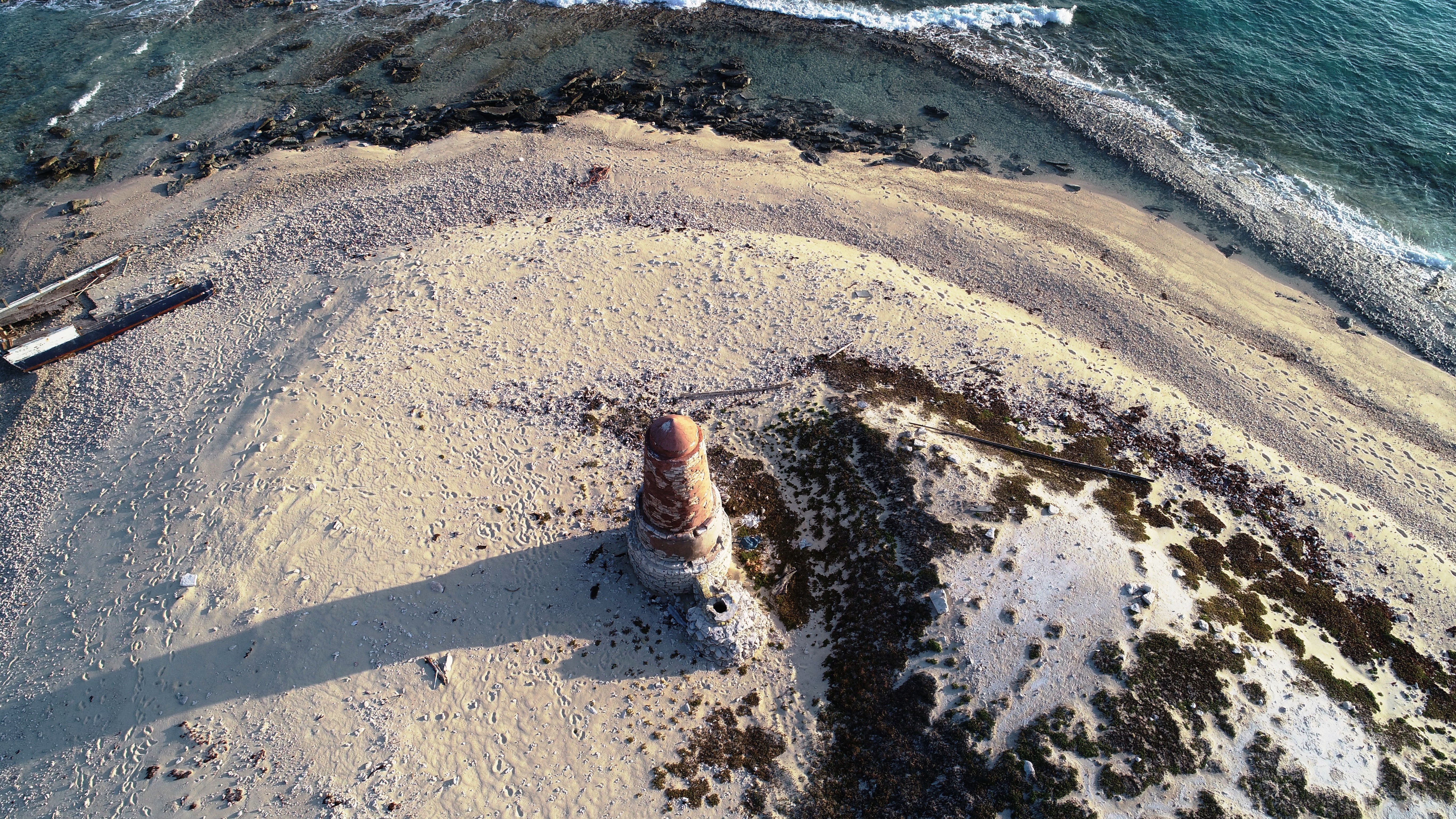 Anders als wir aus der Ferne meinten ist die kleine Sandinsel am Riff wohl nicht mit einem ehemaligen Leuchtturm bebaut. Eher scheint es ein gemauerter Marker zu sein, der nur bei Tageslicht erkennbar ist. Hier mitten im Nirgendwo auf einem kleinen ungeschützten Sandcay wäre ein Leuchttumwärter auch wirklich bedauernswert gewesen. Bei der Inselerkundung am nächsten Morgen sehen wir eine Wasserzisterne, die mit dem Turm verbunden ist.